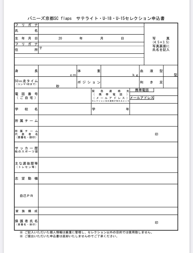 バニーズ京都SC flaps(U-18、U-15)では、 2022年度入団セレクションを実施いたします。